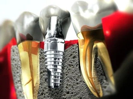 A dental implant is a small, screw-shaped post made of biocompatible materials, usually Nickel-Titanium, that is surgically placed into the jawbone to replace missing teeth roots.